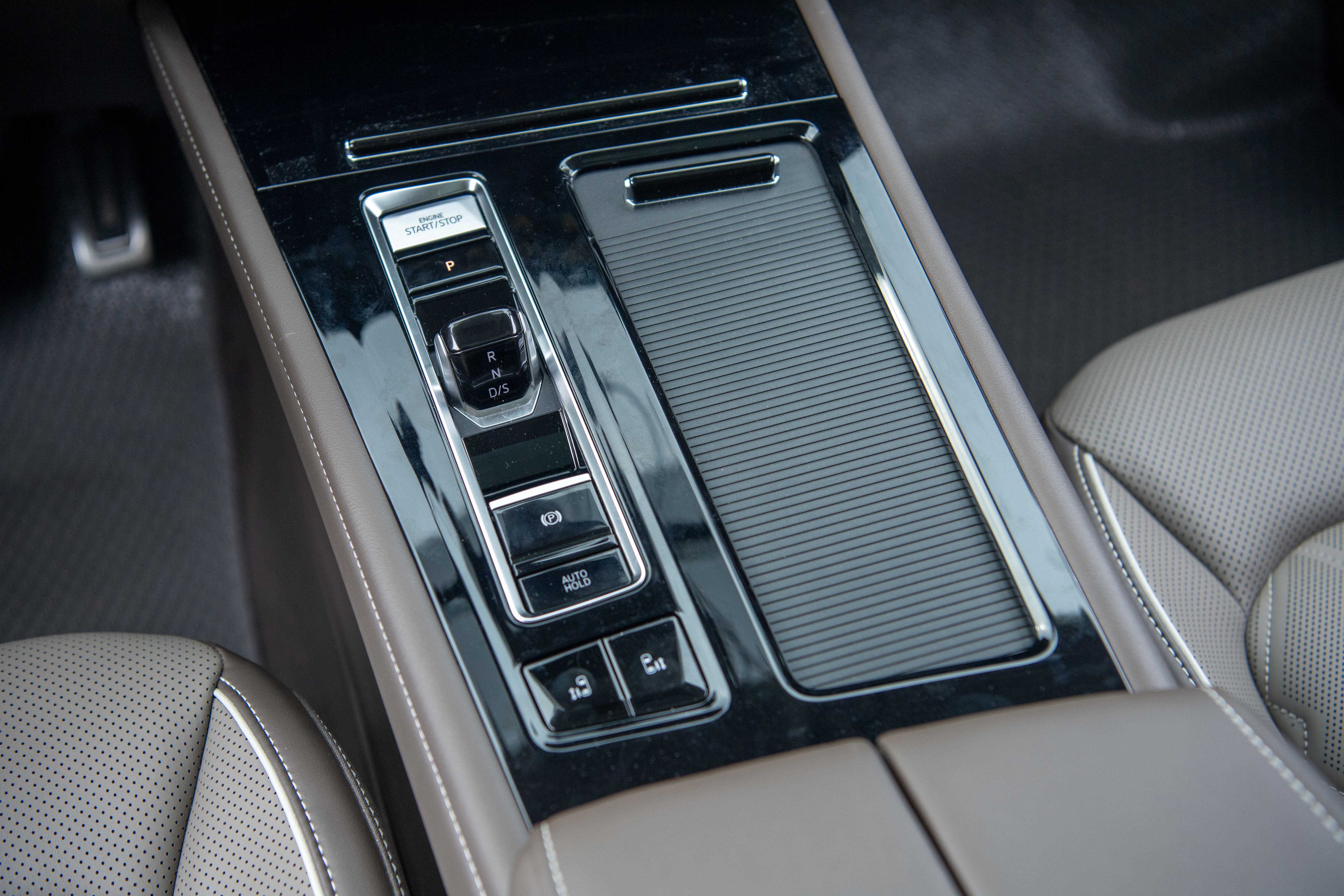 Phần nhựa bóng cũng để lại dấu vân tay. Cần số điện tử của xe được làm gọn gàng và khu vực yên ngựa tích hợp khá nhiều chỗ để đồ, các vị trí đặt điện thoại có kèm sạc không dây và cổng Type C.