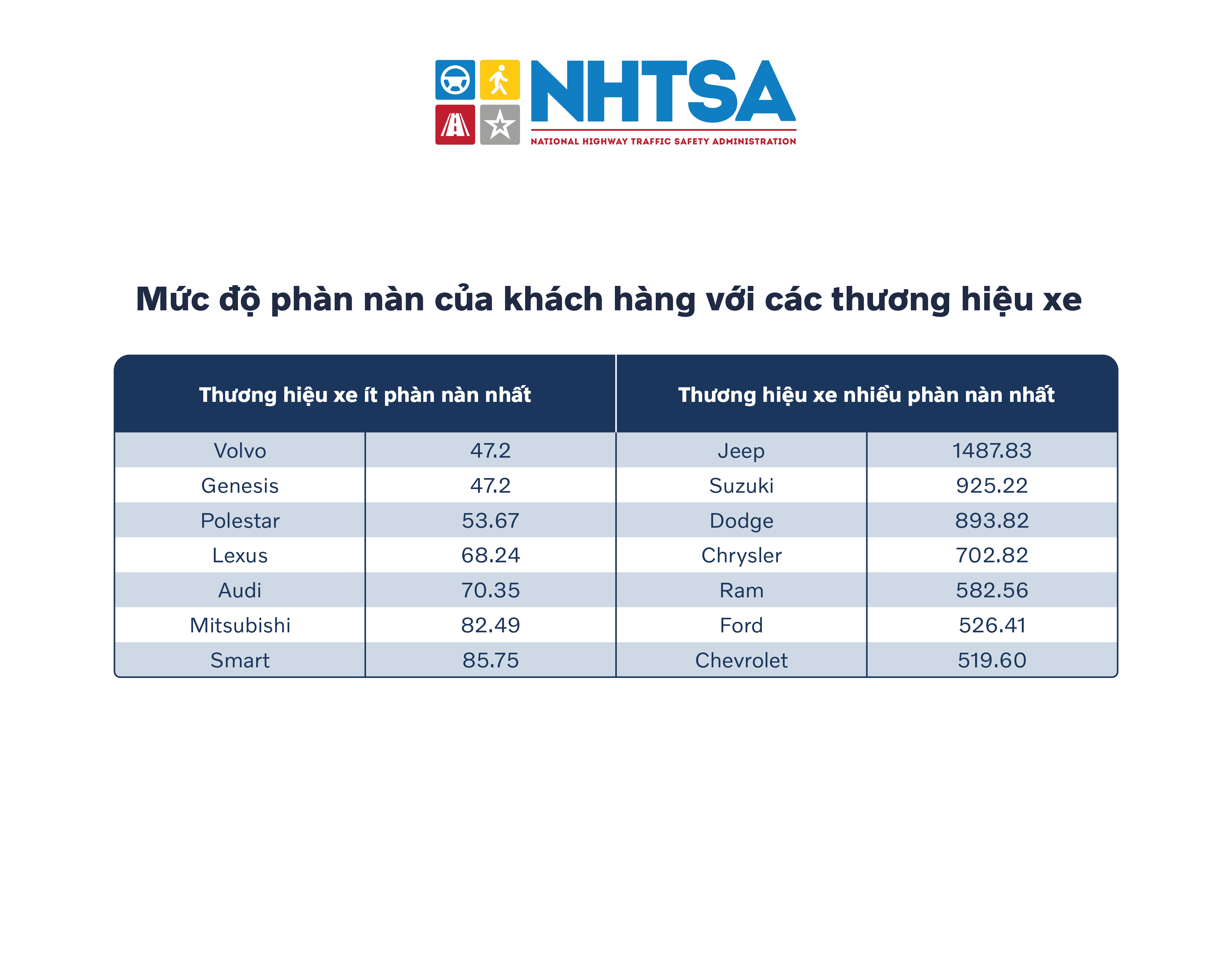 Trong tổng cộng 34 thương hiệu xe được nhắc tới trên 833,761 lượt khiếu nại gửi về Cơ quan An toàn giao thông quốc gia Mỹ (NHTSA), Volvo là cái tên ít được nhắc đến nhất với chỉ trung bình 47,2 phàn nàn trên mỗi mẫu xe khảo sát. Chỉ duy nhất thương hiệu Genesis đạt được sự hài lòng tương tự như Volvo từ phía khách hàng, nhưng trên lượng xe khảo sát thấp hơn đáng kể với chỉ 15 mẫu.